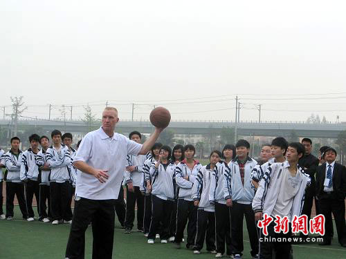 16日,NBA傳奇明星克里斯·穆林及NBA發(fā)展聯(lián)盟球員、北京奧神隊(duì)部分球員來(lái)到都江堰青城山高級(jí)中學(xué),與320名該;@球運(yùn)動(dòng)員一起進(jìn)行籃球訓(xùn)練活動(dòng)。雖然語(yǔ)言不通,學(xué)生們?nèi)栽诖笄蛐堑膸ьI(lǐng)下傳球、運(yùn)球、上籃,過(guò)足了一把NBA打球的癮。