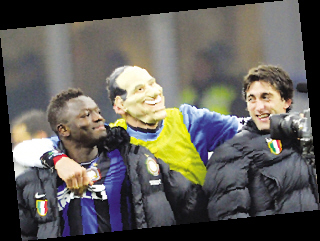 能在9人應(yīng)戰(zhàn)、裁判判罰也不大利于自己的情況下取勝,國米球員們賽后當(dāng)然也顯得興奮異常,隊長薩內(nèi)蒂向球迷致敬,不少藍(lán)黑球員圍抱在一起跳舞唱歌,更為搞笑的是,國米替補(bǔ)鐵衛(wèi)馬特拉齊,再度發(fā)揚(yáng)自己惹是生非、挑釁對手的風(fēng)格,居然戴上了一副不知道從哪里搞來的AC米蘭主席貝盧斯科尼的面具,來嘲諷這位丑聞不斷的意大利總理。盡管不能上場,但大馬善于嘲弄與惡搞對手的頑劣本性,依舊是沒有改變。而AC米蘭球迷與球員,在看到自己的球隊主席與老板,慘遭對手惡搞,只能是恨得牙癢癢,又無可奈何。