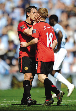 英超第35輪的一場強強對決,自然是曼城斯特市的同城德比。最終,曼聯(lián)憑借35歲的老將斯科爾斯在下半場補時第2分鐘的頭球絕殺,在客場以1:0險勝同城死對頭曼城隊。令人意外的是,同為35歲的曼聯(lián)隊長加里·內維爾居然在場上公然激吻進球功臣斯科爾斯以示慶祝。
