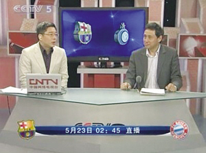 而屏幕下方顯示的字幕圖像居然擺了一個令人啼笑皆非的超級“烏龍”,在字幕上顯示決賽對陣雙方時居然出現(xiàn)巴薩的隊徽,對陣雙方并不是拜仁VS國米。用當下網(wǎng)絡(luò)時髦的話來說,就是衛(wèi)冕冠軍巴薩“被”晉級了。這個大“烏龍”,相信眼尖的球迷都發(fā)現(xiàn)了。