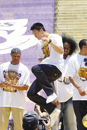 在杰克遜登臺之后,現(xiàn)場主持人開始依次介紹湖人球員,而第一個被介紹的,就是湖人唯一的新秀,中國球員孫悅。在聽到自己的名字被點到時,孫悅顯得十分興奮,走到了舞臺的中央,并高高躍起在空中轉了一個圈,讓一些正在觀看的記者驚呼見到了“中國功夫”。