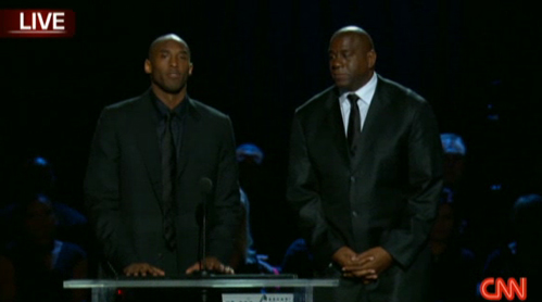 在追思會進(jìn)行到中斷的時候,約翰遜和科比身著黑西裝緩緩步入講臺?票仍诎l(fā)表感言時說,“我們每個人都應(yīng)該銘記邁克爾·杰克遜的貢獻(xiàn),他活在我們的記憶中.在臺上和臺下的他一樣精彩,他永遠(yuǎn)與我們同在!