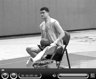 到達豐田中心之后,左腳打著石膏的姚明拄著拐杖坐上火箭的擺渡車,前往訓練場。在訓練場上,火箭隊球員主管布萊特·甘寧前來幫助姚明進行投籃訓練,而姚明坐在凳子上,打石膏的左腿架在椅子上,就以坐姿進行投籃訓練。