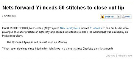 中新網(wǎng)12月7日電 北京時間昨日,據(jù)美聯(lián)社報道,易建聯(lián)在新澤西當(dāng)?shù)貢r間周六早上的一場三對三訓(xùn)練中被隊友用手肘打破了上嘴唇。因為傷勢嚴(yán)重,竟被縫了50針。