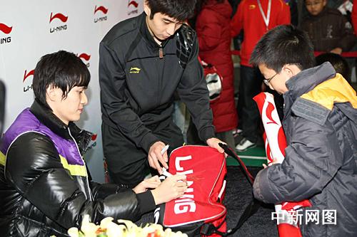 中新網(wǎng)上海十一月二十三日點(diǎn)(宗晨亮)日前,中國(guó)羽毛球名將鮑春來(lái)來(lái)到“2009李寧・中國(guó)羽毛球公開(kāi)賽”球迷體驗(yàn)區(qū),和球迷們進(jìn)行了互動(dòng)活動(dòng),還為大家簽名留念。有意思的是,小鮑的球迷多數(shù)都是女性,主持人也拿此事和他開(kāi)玩笑。