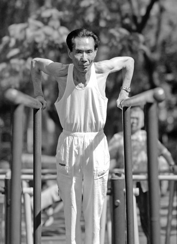 去采訪的攝影記者很年輕,自然想上杠試上一試,沒想到五六個便已支撐不下去了,羞得小伙子直說:“大爺,沒法和你比,太厲害了!