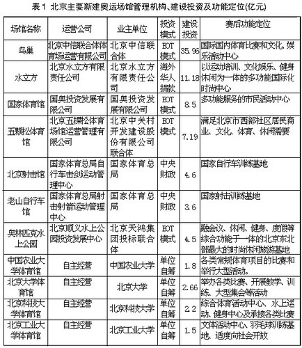 北京奧運(yùn)場館建設(shè)積極借鑒發(fā)達(dá)國家的先進(jìn)經(jīng)驗(yàn),采用BOT模式(指在大型體育場館的建設(shè)中引入民間資本進(jìn)行建設(shè),場館建成后,政府允許其享有一定時期的經(jīng)營權(quán)及經(jīng)營收益,之后政府即無償收回經(jīng)營權(quán)),將場館建設(shè)與賽后利用有機(jī)地結(jié)合起來。北京12個新建奧運(yùn)場館共投資83.69億元,其中業(yè)主自籌占50.46%,地方財(cái)政投資占25.51%,國家財(cái)政投資占10.67%,海外華人捐贈占13.35%(見表1)。一年來奧運(yùn)場館的經(jīng)營業(yè)績證明這種模式是成功的,這無疑為今后我國大型體育場館的建設(shè)和賽后利用提供了可資借鑒的經(jīng)驗(yàn)。