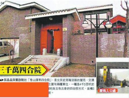 現在,越來越多的跡象都在表明郭晶晶和霍公子的婚期已近。昨天,香港一媒體爆出郭晶晶正準備裝修去年霍家所贈的價值3000萬人民幣的豪華別墅,并稱“這很有可能就是他們倆在北京的婚房!”據說,這套別墅位于北京海淀區(qū)四季青鎮(zhèn)門頭村,在五環(huán)以外。據記者了解,該樓盤的中式院落獨棟別墅面積為300—550平米之間,另外,每棟別墅送150平米的地下室。該別墅在2007年的預估開盤價就高達55000—60000元/平米。難怪媒體都將這一帶的房子稱作“北京頂級私人豪宅群落!