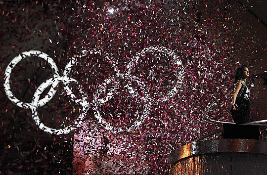 在閉幕式正式開始前還有個(gè)小插曲:會(huì)場中央的火炬臺(tái)仍處在開幕式時(shí)的“殘缺”狀態(tài)。一個(gè)裝扮成電工的小丑來到會(huì)場,找到了一根沒有被正確連接的電源線,爾后,在小丑賣力拉動(dòng)之下,那根開幕式上沒有豎起來的歡迎柱緩緩豎起來了。開幕式上的一個(gè)錯(cuò)誤在今天舉行的閉幕式上被以一種幽默的方式糾正過來。
