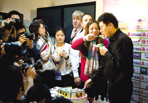 贏得了比賽,走進(jìn)新聞中心的丁俊暉非常開心,“今天比賽很精彩,打得還可以,上來就比較集中精力,今天比較動(dòng)腦子,一個(gè)機(jī)會(huì)得分,還能贏下比賽!边@時(shí)的丁俊暉完全不知道還有一個(gè)意外的驚喜在等著他。在簡(jiǎn)單回答了記者的幾個(gè)問題之后,賽事組委會(huì)的工作人員推上了一個(gè)臺(tái)球桌形狀的生日蛋糕。現(xiàn)場(chǎng)所有的記者和工作人員共同為丁俊暉唱響了生日歌,整個(gè)新聞中心變成了一個(gè)生日party!在所有人的祝福聲中,丁俊暉吹滅了生日蠟燭、切了蛋糕。