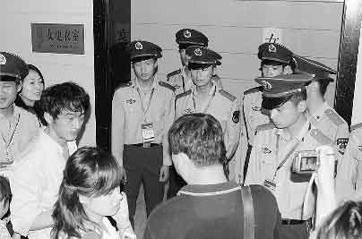 郭晶晶是否真的去找吳敏霞了?這個(gè)記者并不清楚,不過據(jù)記者了解吳敏霞不出席新聞發(fā)布會是因?yàn)楹ε卤弧罢`傷”。在郭晶晶第一次離開新聞發(fā)布會現(xiàn)場時(shí),記者也跟了出去。吳敏霞當(dāng)時(shí)剛剛接受完央視的采訪正準(zhǔn)備走進(jìn)更衣室,但此時(shí)竟然有一位簽名的男FANS跟著吳敏霞走進(jìn)了更衣室,不過好在現(xiàn)場武警反應(yīng)迅速,將他“揪了”出來。見現(xiàn)場形勢已經(jīng)非;靵y,武警索性集體站在了女更衣室的門口,一位現(xiàn)場工作人員邊打著電話,邊嚷著“守好,誰都不讓進(jìn)去”。