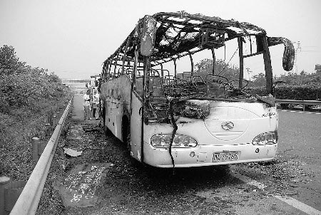 “當(dāng)時(shí)火勢(shì)確實(shí)比較猛烈!背啥枷懒嘘(duì)的消防隊(duì)員說(shuō),上午10時(shí)許接到報(bào)警后隨即趕到現(xiàn)場(chǎng),整個(gè)客車(chē)幾乎被火包圍,30多名乘客站在據(jù)事發(fā)地200多米遠(yuǎn)的路邊,焦急地看著燃燒的客車(chē)卻無(wú)可奈何。消防隊(duì)員立即架起高壓水槍對(duì)著起火的客車(chē)掃射,不到5分鐘,火勢(shì)控制下來(lái)了。