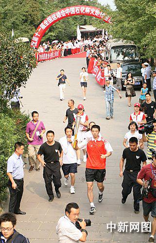 中新網(wǎng)成都8月31日電(陳典路)31日上午,全運(yùn)會(huì)火炬經(jīng)云南傳遞到四川。取自泰山之巔的全運(yùn)會(huì)圣火在地震災(zāi)區(qū)都江堰繼續(xù)傳遞。