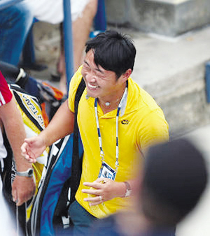 兩盤(pán)比賽,李娜沒(méi)有給對(duì)手任何機(jī)會(huì),丈夫姜山在場(chǎng)下的表情逐漸變得豐富起來(lái),不再是往常那樣的面無(wú)表情或者是淺淺的微笑,從他的臉上能看出明顯的情緒變化,滿(mǎn)臉的笑容能夠讓所有人感受到他的興奮。第二盤(pán)在自己的發(fā)球局里,李娜連得三分拿到三個(gè)賽點(diǎn),并且在第一個(gè)賽點(diǎn)出現(xiàn)時(shí)就拿下比賽。李娜在賽場(chǎng)內(nèi)蹦了起來(lái),姜山和托馬斯在場(chǎng)外也是一陣狂喜,姜山的眼睛瞇成了一條縫,嘴也快咧到耳根。跟往常一樣,姜山和托馬斯在比賽結(jié)束之后就背著球包離開(kāi)。他和托馬斯一邊走一邊聊天,不斷有球迷從他們倆中間穿過(guò),這絲毫沒(méi)有影響兩人的好心情,他們很興奮地一邊聊天一邊比劃著。姜山伸出食指指向天空,難道是已經(jīng)將目標(biāo)瞄準(zhǔn)了第一嗎?