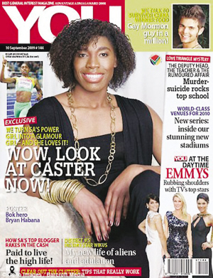 柏林田徑世錦賽上那個在跑道上讓猛男都自愧不如的800米女子世界冠軍塞蒙婭,已經(jīng)成了南非的民族英雄。盡管有報道稱她的睪丸激素含量是正常女性的三倍,國際田聯(lián)對她的性別檢測至今仍無定論,但塞蒙婭如今已搖身一變成了南非時尚雜志《YOU》的封面女郎。
