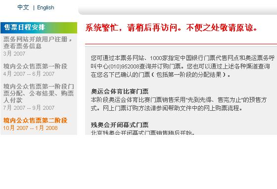 與第一階段抽簽決定門票獲得者不同,此次發(fā)售實行“先到先得,售完為止”的銷售政策。所以9點鐘剛過,記者就嘗試打訂票熱線,不過30分鐘后,記者還是沒有打通。記者隨后嘗試訪問北京奧運會官方票務(wù)網(wǎng)站,該網(wǎng)站顯示“系統(tǒng)繁忙,請稍后再訪問。不便之處敬請原諒!焙髞碜屍渌笥言L問,則干脆訪問不了頁面。