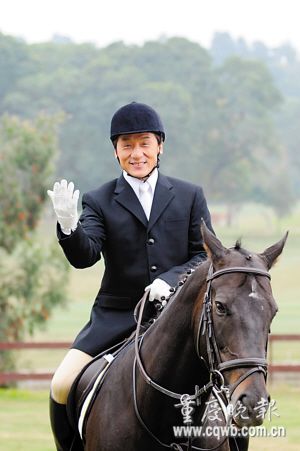 盡管成龍在眾人心目中的形象更多是一位功夫明星,不過追星族近期看到他穿起馬靴、戴起馬帽化身馬術騎士,代言今年夏天在中國香港舉行的奧運馬術賽。“2008年在奧運馬術賽城市——香港見,”身著一身騎師裝束的成龍說,他同時在鏡頭前抓著一匹漂亮黑馬的韁繩。