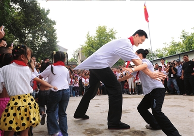 游戲開始了,一位高年級同學(xué)當(dāng)老鷹,姚明則當(dāng)雞媽媽,其他的同學(xué)做小雞。姚明張開雙臂,彎著身子,直視前方,掩護(hù)著正在身后休息的孩子們。不一會兒,兇猛的“老鷹”如猛虎出山似地飛過來,用左晃晃、右看看,想要出擊卻找不到合適的機(jī)會。正當(dāng)大家有些松懈的時候,“老鷹”猛地一陣,展開有力的翅膀向姚明身后的孩子們發(fā)動了襲擊。姚明左顧右盼,進(jìn)行有力阻擋,但是一不留神,后面的孩子們突然掉隊(duì)!袄销棥表槃莼钭搅穗x隊(duì)的孩子們!翱靵砭任!”聽到孩子們的呼喊,姚明立即轉(zhuǎn)了方向,趕走身后的“老鷹”。場上玩的開心,場下也看得開心,加油聲、歡笑聲回蕩在小小的校園內(nèi)。兩個回合下來,雖然有些疲倦,但是姚明和小孩們都還不盡興,再次回到場內(nèi)過把癮。當(dāng)裁判老師一聲哨響宣布結(jié)束時,姚明才有些戀戀不舍地回到了座位。(徐楊 陶玲 彭晗)