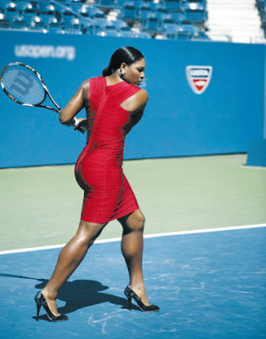 腳穿高跟鞋,擺起了POSE。大威笑著說:“時尚是要付出代價的,真打網(wǎng)球,可不敢這么穿。” (李輝)