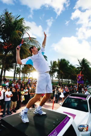 邁阿密當(dāng)?shù)貢r間3月23日,為了宣傳索愛公開賽,大威和穆雷分別站到一輛車上,打起了“車上網(wǎng)球”。