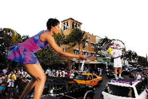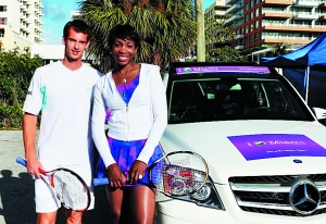 美國(guó)名將大威和本賽季大紅大紫的穆雷近日為邁阿密大師賽造勢(shì),穆雷和大威分別站在轎車頂端對(duì)打,大秀“高空網(wǎng)球”。由于是本土作戰(zhàn),大威在邁阿密人氣極高,被捧得猶如女皇一般。比賽中,大威穿著靚麗的連衣裙,化身成“花蝴蝶”。