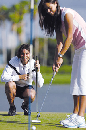 不過此組納達(dá)爾與伊萬的高球互動組圖更有“曖昧”的味道。在果嶺上,納達(dá)爾隨時幫忙糾正伊萬的推桿動作,而每次伊萬將球推進后,納達(dá)爾更是給出鼓勵,在果嶺上帥男靚女的傳情更讓人浮想聯(lián)翩,難道這兩人才是“戀人”?