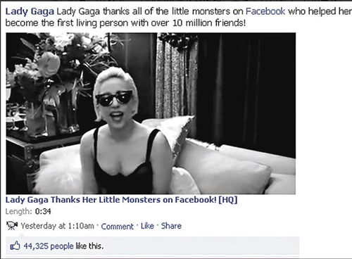 中新網(wǎng)7月6日電 據(jù)香港“文匯報”消息,Lady Gaga人氣爆燈絕對不是空話。與不少明星一樣,Gaga也有利用社交網(wǎng)站與粉絲互動。據(jù)悉,Lady Gaga在2月時已有500萬名粉絲關(guān)注,當(dāng)時還比性感女星梅根·?怂股贁(shù)十萬,也比美國現(xiàn)任總統(tǒng)奧巴馬的700萬名支持者要少。但Lady Gaga果然名不虛傳,以平均每天14萬人關(guān)注的速度,至上周已錄得1千萬的紀(jì)錄,比一直領(lǐng)先她的總統(tǒng)奧巴馬還要超前約100萬票。獲得這一喜訊后,Gaga在另一社交網(wǎng)站寫道︰“多謝那么多小魔怪在Facebook追隨我。我有一千萬個互相緊扣的朋友了!