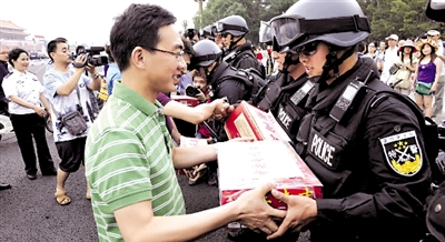 昨天下午,李瑞英、朱軍、郎永淳等中央電視臺和北京電視臺的十多位名嘴,為正在執(zhí)勤的特警隊員和交警,送去酸梅湯等夏季消暑飲品。近日,市公安局巡特警總隊,在長安街沿線及重點地區(qū)加強了巡邏防控和武裝震懾。據(jù)了解,特警們每人每天身上的槍支、防彈衣等裝備,需要負(fù)重數(shù)十公斤!案邷乜崾,特警們還著裝整齊,一站十多個小時,他們確實是最值得尊重的!敝燔娬f。 記者 董世彪 郭曉樂 攝影報道