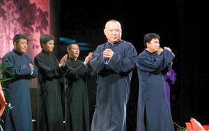 郭德綱、于謙合作10周年專場演出14日如約開場,現(xiàn)場座無虛席。此番亮相的郭德綱顯得頗為低調(diào),他在對話中表示,自己只是一個說相聲的,“能力有限,水平一般”。此次演出郭德綱個人為舟曲災區(qū)捐出了10萬元,德云社和演出承辦方也各捐出5萬元,對于因為哀悼日而暫停的15日的演出,郭德綱表示:所有15日票的觀眾都可以去退票,也可以留著,等我們開演的時候繼續(xù)使用。現(xiàn)在不是我們不訂演出時間,實在是北展后面的演出太多了,一切需要重新協(xié)調(diào)!