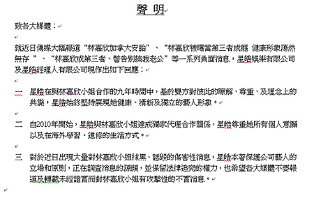 就在新聞鬧的沸沸揚揚的同時,林嘉欣所屬的香港經(jīng)紀公司星皓昨天發(fā)表聲明,提到“公司和林嘉欣合作9年,堅持展現(xiàn)她健康、清新及獨立的藝人形象。2010年彼此達成獨家代理合作關(guān)系。”更強調(diào)“近日出現(xiàn)對林嘉欣抹黑、詆毀的傷害性消息,正在調(diào)查消息的源頭,并保留法律追究的權(quán)力!
