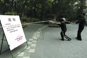 在公園門口和警戒線旁,均貼出落款為公園管理處的通知:“因公園9月25日有重要活動(dòng),需占用此場(chǎng)地,望各晨練群體暫;顒(dòng)1天”,通知中的時(shí)間部分有被白紙粘貼的痕跡。