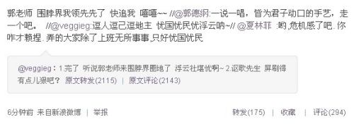 @veggieg:完了 聽(tīng)說(shuō)郭老師來(lái)圍脖界圈地了 浮云社堪憂啊~轉(zhuǎn)念一想 織圍脖這么女紅滴干活 郭老師還真不一定有那么細(xì)的針腳~ 呵~