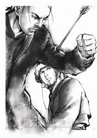 “電腦技術(shù)能很好地解決毛筆技法較難處理的地方”,光祖說,“而且電腦上色快,易修改,效率高 ,有問題可以馬上解決,便利性強。在決定用水墨技法以后,我們用了較長的一段時間去用電腦體現(xiàn)毛筆的感覺,剛開始的時候還遇到不少困難,還好到最后還是解決了!彼f:“所有的連載都是用毛筆作底稿,后期再用電腦去潤色,增強國畫效果。在創(chuàng)作初期,毛筆的底稿是必要的,漫畫所有的基調(diào)還是要一筆一劃畫出來,而后期的潤色,則用電腦,這樣互相配合,才能充分發(fā)揮兩者的優(yōu)點嘛!