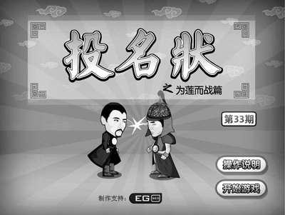 而互動(dòng)惡搞《投名狀》的游戲也很有趣,就是趙二虎發(fā)現(xiàn)自己夫人蓮生和龐青云有染,為了挽回男人的尊嚴(yán),他只有靠武力來證明自己是最強(qiáng)的,請(qǐng)參與游戲者幫趙二虎來挑戰(zhàn)龐青云。而游戲規(guī)則就是使用控制鍵,控制趙二虎挑戰(zhàn)龐青云,在規(guī)定時(shí)間內(nèi)打敗龐青云即告勝利。在熟悉了游戲規(guī)則之后,此類惡搞并無難度系數(shù)。勝者王敗者寇,如果輸了,趙二虎會(huì)慚愧跪地說:“為什么我會(huì)輸?我才是元配!倍嬊嘣苿t會(huì)摟著蓮生說:“我是唯一的選擇,請(qǐng)支持壹基金!苯Y(jié)果令人忍俊不禁。