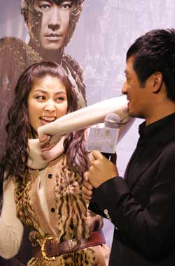 《江山美人》也是三個男人和一個女人的故事,陳慧琳在戲里受到郭曉冬的“陷害”,戲外,陳慧琳為了“報仇”,先發(fā)制人對郭曉冬發(fā)起了“攻擊”,但到最后還是被郭曉冬“欺負”。