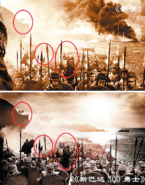 一張《赤壁》和《300勇士》的對(duì)比照昨日成為網(wǎng)友熱議的焦點(diǎn)。照片發(fā)布者圈出吳宇森新片《赤壁》官方海報(bào)中和《斯巴達(dá)300勇士》劇照的相似之處,并直指《赤壁》抄襲。對(duì)此中影營(yíng)銷分公司負(fù)責(zé)人直斥“無(wú)聊炒作”,并稱“每款海報(bào)都有不同的風(fēng)格!