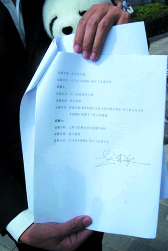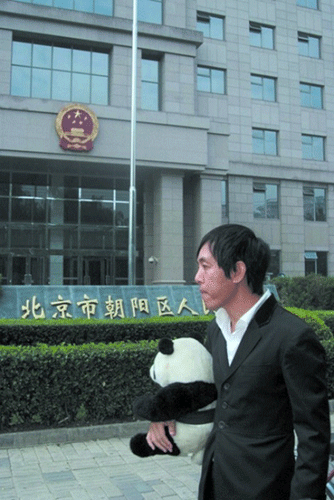 “我就不明白了,熊貓?jiān)趺磿?huì)是綠色眼睛?夢(mèng)工廠必須給我作出解釋!……”趙半狄頭頂熊貓,手拿起訴書,以及法院的受理號(hào),理直氣壯地站在朝陽(yáng)區(qū)人民法院的門口,和他的委托代理人站在一起,“咔嚓”了好幾張照片,都貼進(jìn)了他的博客。