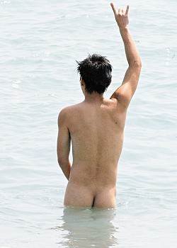 中新網(wǎng)9月19日電 電影《海角七號》臺灣票房大破1億元(新臺幣,下同),范逸臣兌現(xiàn)裸泳承諾,在墾丁全裸入海,更全身涂滿助曬油增加肌膚黑亮質(zhì)感,泡在海里時還不忘興奮大喊:“我終于用我自己獨特的方式,為《海角七號》的驚人票房慶功啦!”