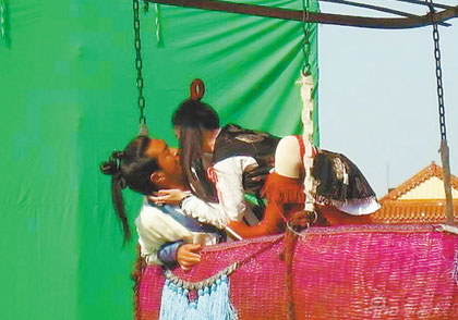 記者前往探班的一場戲,是該劇最后一幕:古天樂和大S經(jīng)歷種種波折終于走到了一起,在古天樂用風箏和竹筐連成的“熱氣球”里度過浪漫時光。由于過于浪漫,大S演的俠女便起了“色心”,于是發(fā)生了強吻這一幕。