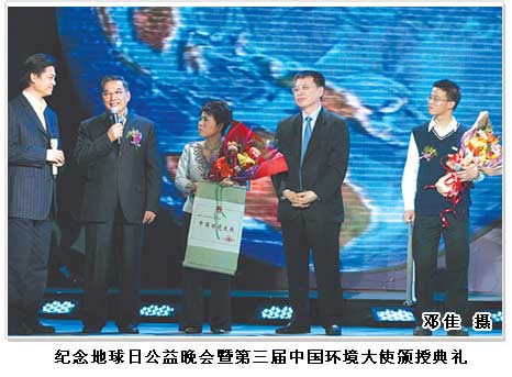 本報(bào)4月22日訊 “紀(jì)念地球日公益晚會(huì)暨第三屆中國(guó)環(huán)境大使頒授典禮”今日在京舉行。宋祖英等10人被環(huán)境保護(hù)部聘為新一屆“中國(guó)環(huán)境大使”。全國(guó)政協(xié)副主席李金華、國(guó)家發(fā)改委副主任解振華、環(huán)境保護(hù)部副部長(zhǎng)潘岳等出席頒授典禮。
