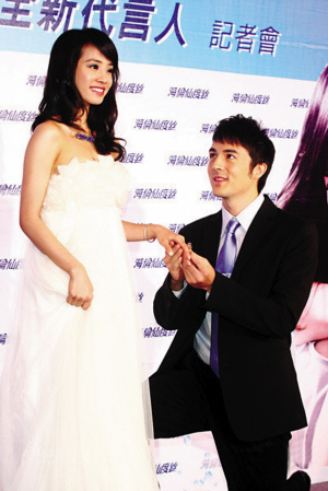 蔡依林前天為洗發(fā)水代言披婚紗,化身美嬌娘的她與廣告中的男友舉辦世紀(jì)婚禮。廣告中的帥哥男友下跪幫她戴婚戒,蔡依林感覺自己很幸福。