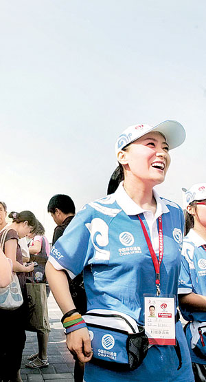 昨天,歌手譚晶來到鳥巢旁的志愿者服務(wù)站,履行她作為奧運(yùn)志愿者的義務(wù)。