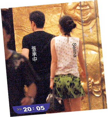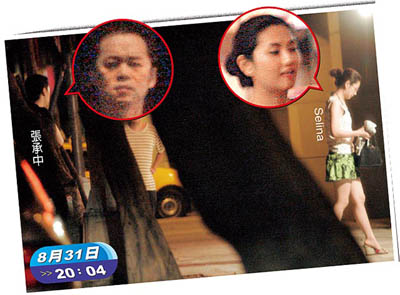 八月三十一日晚間八點(diǎn),張承中開著Selina的車來到臺(tái)北市敦化南路上的“驥園川菜館”,穿著短裙白背心的Selina則從副駕駛座下車,刻意低著頭走進(jìn)餐廳,而一身黑色休閑服的張承中,將車鑰匙交給泊車小弟后,也跟著Selina走進(jìn)餐廳,一路不停盯著遠(yuǎn)方看有無狗仔車,非常謹(jǐn)慎小心。