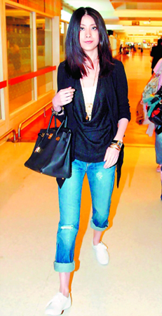陳慧琳手提價值近8萬港幣的愛瑪仕黑色皮手袋去臺灣開工,她笑稱:“這包有一半來自雷頌德的禮金!