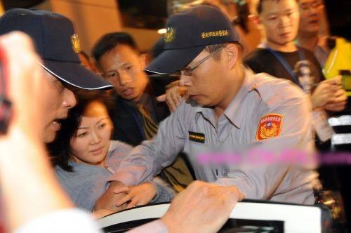 央視主播柴璐(灰衣)等媒體人員遭民眾圍堵辱罵,在警方保護(hù)下搭警車離開(kāi)。