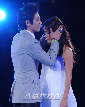 據(jù)體育朝鮮報(bào)道,15日晚7時,在首爾蠶室室內(nèi)體育館舉行的“2008 Mnet-KM音樂節(jié)”( 以下簡稱“MKMF”)上,李孝利和T.O.P在共同演繹《謊言》時,表演了兩個嘴唇互碰的熱吻場面。