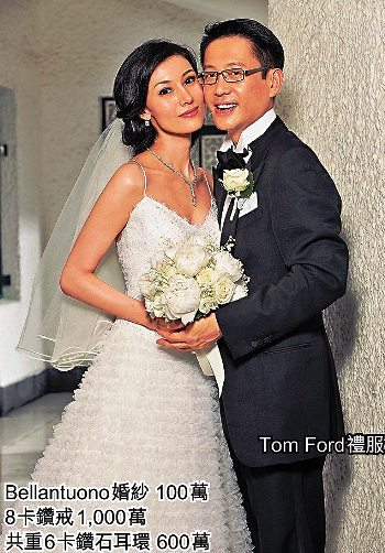 據(jù)報(bào)道,新娘子李嘉欣在婚禮上穿了兩套婚紗,一套是由李嘉明同學(xué)、香港著名設(shè)計(jì)師張潔雯(Bonita Cheung)設(shè)計(jì)的米白色低胸婚紗,上身繡銀線及立體喱士,裙襬則是八層真絲網(wǎng)紗,配以頭紗及18呎長(zhǎng)拖尾,超過(guò)30萬(wàn)元,由設(shè)計(jì)師當(dāng)禮物送予嘉欣。另一套婚紗,則是于名人婚紗店The Wedding Shop訂做的意大利婚紗Bellantuono,由40個(gè)師傅、用200小時(shí)專人縫制,約值100萬(wàn)元。亨亨的禮服則是Tom Ford出品。