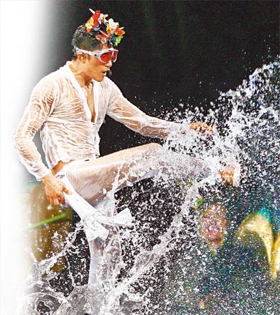 中新網(wǎng)12月15日電 郭富城(城城)前天起一連2晚重回他成名地臺灣開唱,幾近2萬人前往臺北小巨蛋熱情捧場。他18年前因來臺拍機車廣告,憑潑水鏡頭一潑成名,演唱會上,特別把水舞步道,端上中央舞臺周邊,以“水”回饋歌迷。郭富城身穿白色薄衫、薄褲,與前排歌迷盡情戲水,濕身后身材呈半裸,引歌迷熱血沸騰。