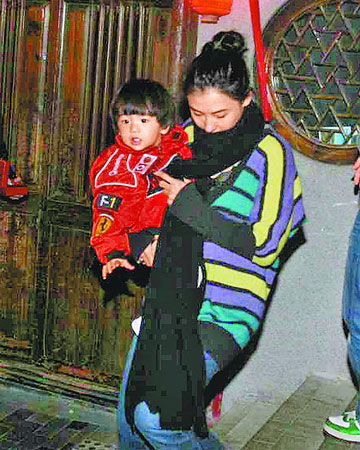體態(tài)飄孕味的張柏芝前晚抱兒子Lucas小心翼翼下樓梯。