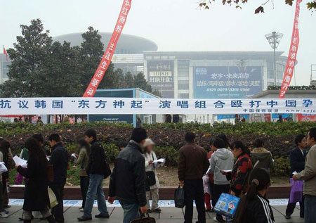 中新網(wǎng)12月26日電 近日,一篇題為《東方神起武漢演唱會前夕遭現(xiàn)場抵制》的帖子熱傳國內(nèi)各大網(wǎng)站論壇,該帖一出即引發(fā)大量網(wǎng)友口水戰(zhàn)。文章說,2008年12月20日,來自武漢三鎮(zhèn)的志愿者在武漢會展中心地區(qū),就“東方神起”針對中國女性的暴力行為發(fā)動簽名抗議,志愿者高舉“抗議韓國‘東方神起’演唱組合毆打中國孕婦”條幅,呼吁市民積極參與此次抵制活動。雖然到目前為止,整件“毆打孕婦”事情的真?zhèn)涡赃沒有一個官方的說法,但網(wǎng)友這種自發(fā)的行為還是吸引了大量的觀望著,甚至有眾多路人在條幅上簽名表示支持。